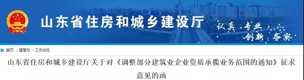 為扶持建企做大做強,近日山東省住房和城鄉建設廳、交通運輸廳、水利廳聯合發文,就《調整部分建筑業企業資質承攬業務范圍的通知》公開征求意見。《通知》提到: