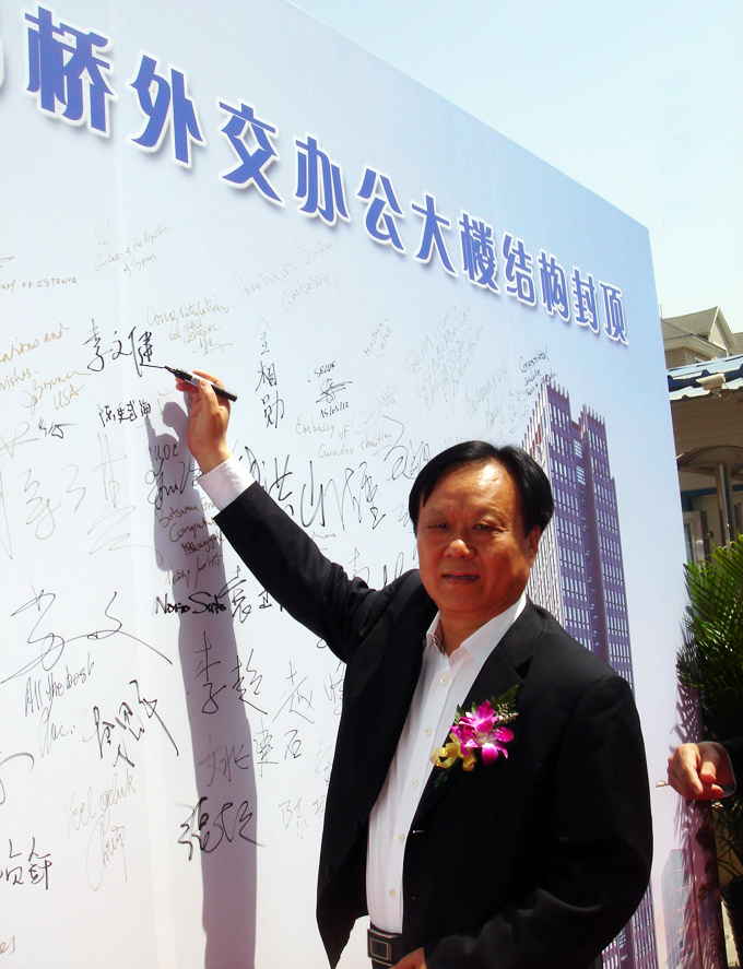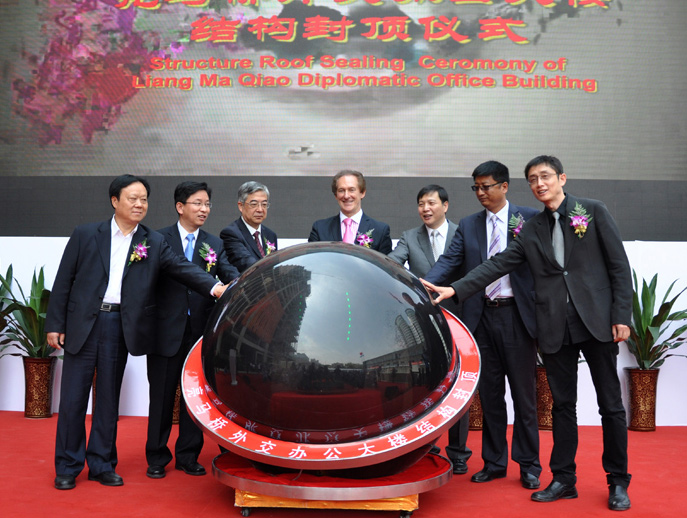 2013年5月15日上午,伴隨著最后一方混凝土的成功澆注,在50余名駐華外交使節以及外交部、北京市等有關部門代表的見證下,由集團公司第八工程局承建的亮馬橋外交辦公大樓工程正式實現主體結構封頂。董事局主席李文。ㄗ笠唬⿷鱿瘍x式。