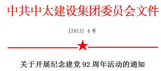 為慶祝中國共產黨建黨92周年,弘揚黨的光榮傳統和優良作風,進一步調動和激勵廣大黨員“關心中太、維護中太、效力中太”工作的熱情,開創各項工作創新驅動和科學發展的新局面,為完成2013年各項工作任務和經濟技術指標鼓勁加油,推動集團公司又好又快發展,深入貫徹黨的“十八大”精神和習近平同志關于在全黨進一步“轉變作風、端正學風、改進文風”的要求,結合集團公司實際,集團黨委決定,在“七·一”前后,開展以下系列活動: